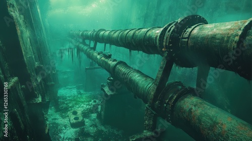 © Umi Sakina, Fototapeta premium Underwater rusty pipes, shipwreck background