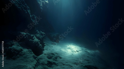 Obraz premium Underwater scene depicting a deep sea cave with sun rays penetrating the surface