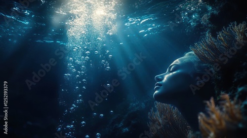 © Aleksandra, Obraz premium Underwater Scene Ethereal Lighting Deep Blue Surreal Style Bubbles Coral High Contrast Cinematic Composition