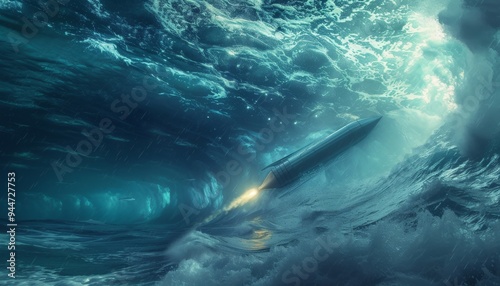 Fototapeta premium Underwater scene featuring a satellite stealthily launched like a torpedo 🌊🚀. Dynamic, futuristic launch captured with detailed underwater effects.