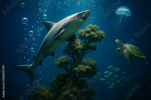 Fototapeta premium Underwater Scene Featuring a Shark, Turtle, and Jellyfish in a Coral Reef...