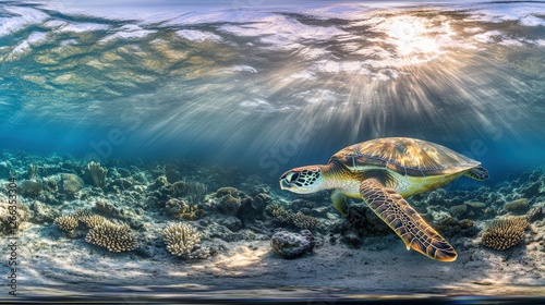 Obraz premium Underwater scene featuring a turtle swimming gracefully above coral reefs with sunlight filtering through