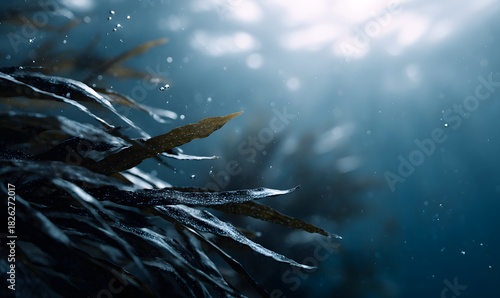 © simba kim, Fototapeta premium underwater scene featuring dense black algae strands gently flowing in marine currents, deep ocean blue environment, soft rays of sunlight penetrating from above, tiny air bubbles rising, glossy wet