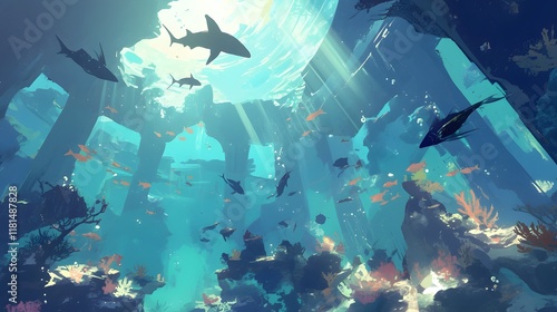 Fototapeta premium Underwater scene featuring fish and coral, with rays of light filtering from...
