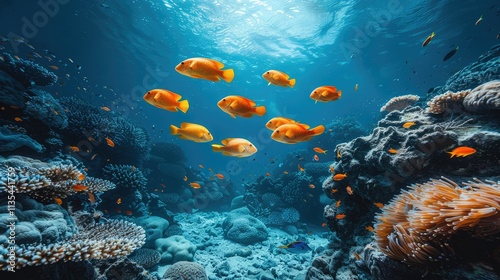 Fototapeta premium Underwater scene featuring vibrant orange fish swimming among coral reefs.