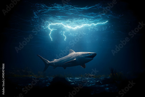 Fototapeta premium Underwater Scene of a Shark Swimming Beneath a Stormy Ocean with Lightning in the Background