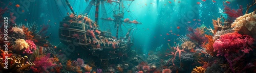 © owen, Naklejka premium Underwater scene of a sunken pirate ship