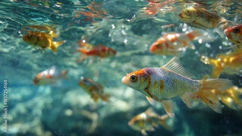 © Plaifah, Naklejka premium Underwater Scene of Colorful Fish Swimming Gracefully in Clear Water With Rippling Light and Serene Aquatic Environment, Perfect for Nature Lovers