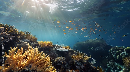 Naklejka premium Underwater Scene Of Coral Reefs And Schools Of Fish With Sunbeams