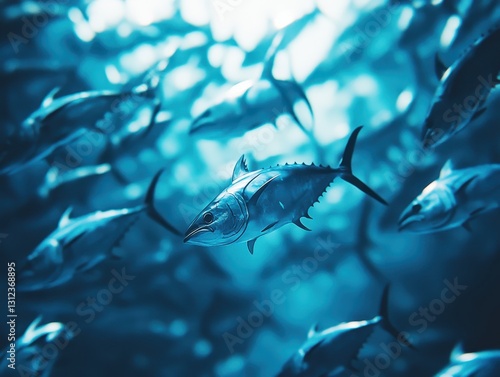 © ANUAR, Fototapeta premium Underwater Scene of Schools of Fish Swimming in Clear Blue Ocean Water, Captivating Marine Life Displaying Graceful Movements and Natural Habitat