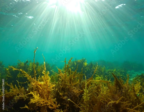 © lemah, Naklejka premium Underwater scene of sunlit kelp forest
