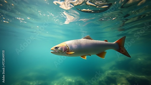 © Xiao, Fototapeta premium Underwater scene of trout swimming in a clear river with natural light creating a serene aquatic atmosphere.