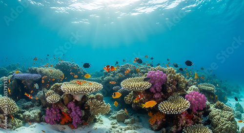 Naklejka premium Underwater scene showcasing a vibrant coral reef teeming with diverse marine life, illuminated by sunlight.