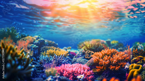 Naklejka premium Underwater scene showcasing a vibrant coral reef with sunlight filtering through the ocean surface above