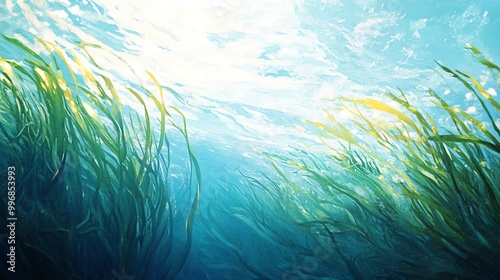 © Benjarin, Fototapeta premium Underwater scene showcasing vibrant aquatic plants swaying gently in clear blue water, illuminated by sunlight filtering through.