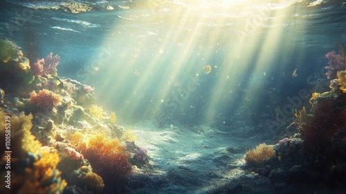 Fototapeta premium Underwater scene showcasing vibrant coral reef illuminated by sunlight beams...