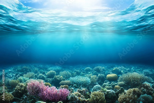 © Jenjira, Naklejka premium Underwater scene showcasing vibrant coral reefs and clear blue water.