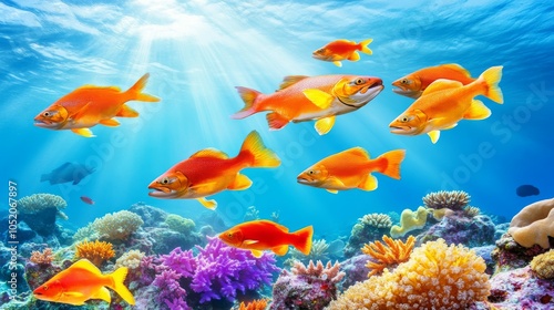 © Jardel Bassi, Fototapeta premium Underwater Scene Showing a School of Salmon Swimming Gracefully in Clear Blue Ocean Waters