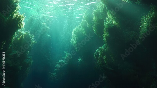 Fototapeta premium Underwater Scene Sunbeams Illuminate Lush Aquatic Plants