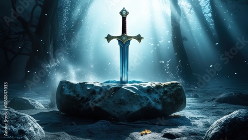 © uon, Naklejka premium underwater scene, sunken rowboat, ocean floor, blue-green water, shafts of light, sunbeams penetrating water, atmospheric, mysterious, ethereal, submerged, abandoned vessel, marine environment, deep s
