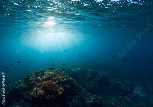 Fototapeta premium Underwater Scene Sunlit Ocean Waters, Coral Reef, and Fish in the Deep Blue Sea
