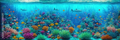 Fototapeta premium Underwater Scene - Tropical Seabed With Reef And Sunshine. Banner. Generative AI