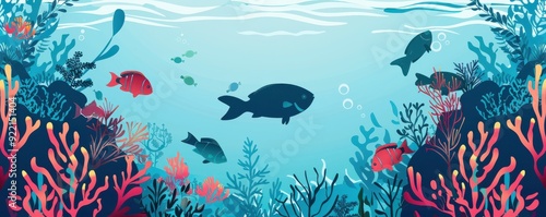 Fototapeta premium Underwater scene with cartoon fish and colorful coral, flat vector design.