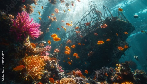 © ANUAR, Fototapeta premium Underwater Scene with Colorful Coral Reefs and Sunlight Shining on a Shipwreck Surrounded by Tropical Fish in a Vibrant Marine Ecosystem