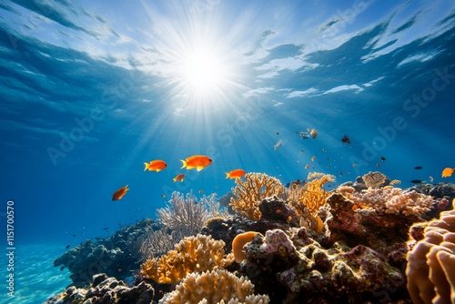 © AndiAzis, Naklejka premium Underwater scene with coral and colorful fish.