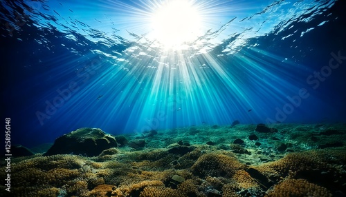 Fototapeta premium Underwater scene with coral reef and sun lights