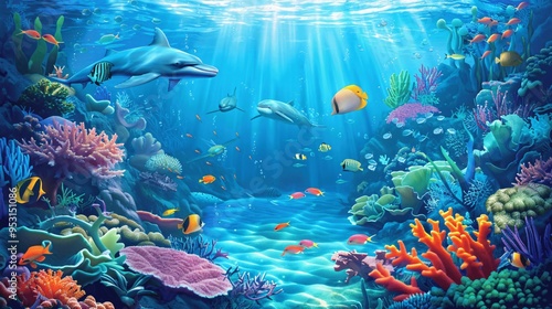 Fototapeta premium Underwater Scene with Dolphins Coral Reefs and Colorful Fish