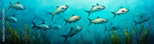 Naklejka premium Underwater scene with fish swimming among seaweed in blue water