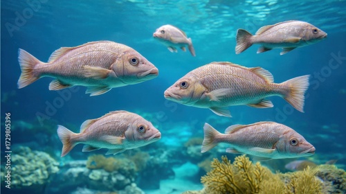 © 69, Naklejka premium Underwater Scene with Schools of Fish Swimming Gracefully in Blue Ocean Waters Near Coral Reefs and Marine Life in Natural Habitat