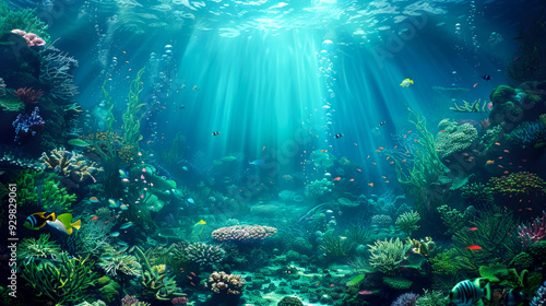 Fototapeta premium Underwater Scene with Sunbeams, Colorful Fish, and Lush Coral Reef