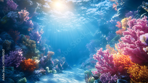 Obraz premium Underwater scene with sunbeams filtering through the water, calm ocean...