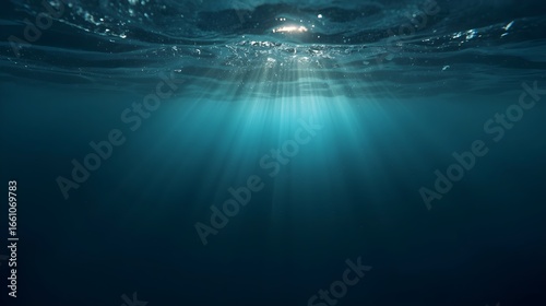 © Md, Obraz premium Underwater scene with sunbeams filtering through the water creating shimmering light patterns on the deep blue ocean surface evoking tranquility and mystery.