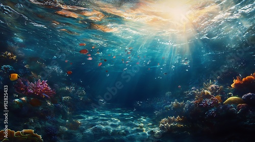 Fototapeta premium Underwater Scene with Sunbeams Illuminating Coral Reef and Fish