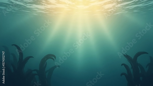 Fototapeta premium Underwater scene with sunbeams shining through the water onto kelp