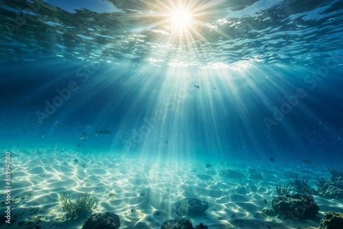 Fototapeta premium Underwater scene with sunlight beams shining through the clear blue-green water, creating a serene and tranquil atmosphere
