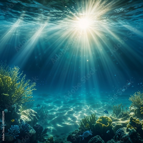 Fototapeta premium Underwater scene with sunlight beams shining through the clear blue-green water, creating a serene and tranquil atmosphere