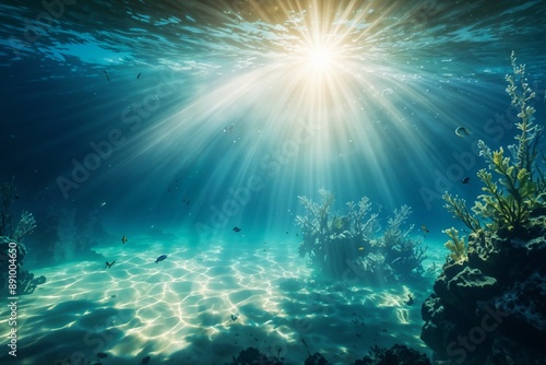 Fototapeta premium Underwater scene with sunlight beams shining through the clear blue-green water, creating a serene and tranquil atmosphere