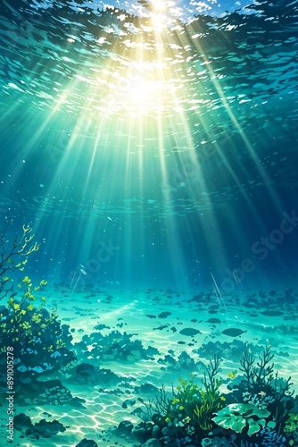 © figi, Fototapeta premium Underwater scene with sunlight beams shining through the clear blue-green water, creating a serene and tranquil atmosphere