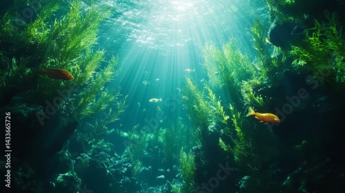 © NawasenaRid, Fototapeta premium Underwater Scene with Sunlight Rays, Green Algae, and Goldfish