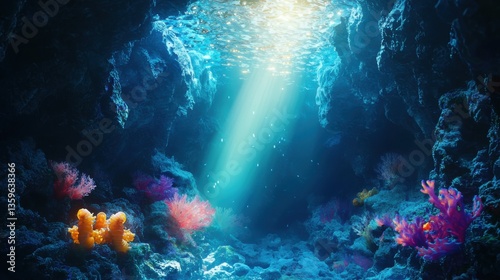 Fototapeta premium Underwater Scene with Vibrant Coral and Sunlight Rays in Ocean Depths