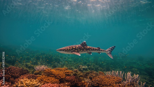 Obraz premium Underwater scene with zebra and leopard sharks amid vibrant coral formations,...