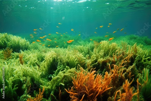 Naklejka premium Underwater scenery with small fish and filled with green algae