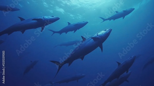 Fototapeta premium Underwater School of Sharks Swimming in Deep Blue Ocean