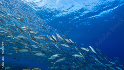 © SolaruS, Fototapeta premium Underwater School of Silverfish Swimming in Blue Ocean and Copy Space