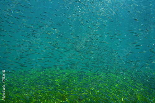 Fototapeta premium Underwater school of small fish over grassy seabed, Atlantic ocean, Florida