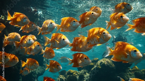 Fototapeta premium Underwater school of vibrant orange fish swimming near coral reef.